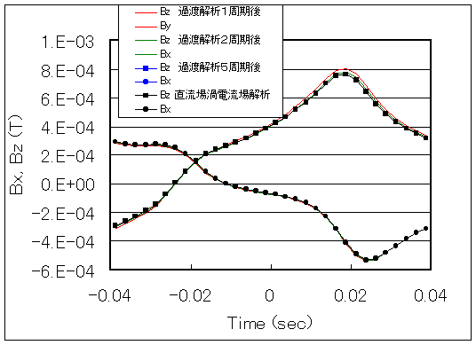 以上のように、過渡解析と直流場渦電流はほとんど同じ結果となっており、本直流場渦電流解析の妥当性が示されました。本例では2周期程度で収束しますので、過渡解析で計算を行うことができますが、それでも60ステップ以上の解析が必要とされ、1ステップで定常状態が求められる直流場渦電流解析の意義は大きいと思われます。