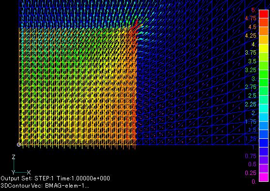If you look closely at the magnetic field distribution, you can see that the magnetic field is disturbed near the central axis. For example, in Fig. 2, the magnetic field strength oscillates in the radial direction. Fig.4 and Fig.5 show the magnetic field strength distribution. In particular, when the plot is based on nodal data, the strength is higher at a greater distance from the axis. Of course, this is a numerical error, but it is not caused by the pyramid element. The same can be seen with the quadrangle element. Such errors have been known for a long time. This is due to the fact that linear edge elements of warped triangular prisms and hexahedrons cannot represent a uniform magnetic field. In particular, when the magnetic field is obtained by interpolating the shape function, the accuracy of the magnetic field drops at the edges of the element. This is why the result shown in Fig. 5 is obtained. At the center of the element, the accuracy is relatively good and the distribution is quite reasonable when using the element data in Fig. 4. To solve this problem near the center axis, it may be necessary to change the element shape function. For axisymmetric elements, it seems possible to make improvements, which we will consider in the future.
