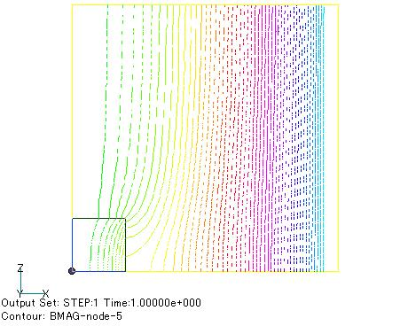 In EMSolution, a two-dimensional mesh is extended to a three-dimensional mesh for two-dimensional analysis. For this reason, in a two-dimensional axisymmetric problem, an element tangent to the axis at one point becomes a square pyramid when extended, and we have requested that such an element not be defined in the past. We have eliminated this restriction by adding pyramid (tetragonal pyramid, pentahedron) elements. Here is a simple example: Fig. 1 and Fig. 2 show the analytical mesh. The domain is divided entirely by triangles, including triangles tangent to the axes at a single point. Conventionally, the points tangent to the axis would have to be rectangles. This model simulates a circular cylinder. Fig. 1 and Fig. 2 show the magnetic flux density distribution and Fig. 3 shows the magnetic flux line distribution.