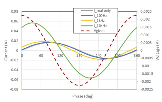 where $n$ is the number of turns, $S$ is the sample cross-sectional area, and $l$ is the average magnetic path length. The effect of complex permeability at 100 Hz shows only a slight bulge in the current phase-difference curve, but at 1 kHz it is even larger, and at 10 kHz it is significantly larger. As explained earlier, the magnetic loss can be calculated from the area in the BH loop or from equation (2). Table 1 shows the magnetic loss calculated by the above method and inside EMSolution. Note that the $H_0$ used in equation (2) is the amplitude of H calculated in equation (4). It can be confirmed that they are in good agreement.