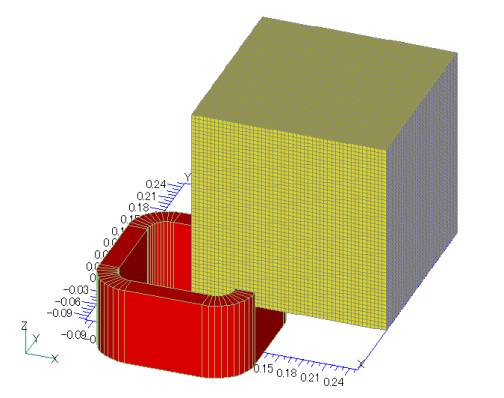 As an example, let us calculate the magnetic field generated by the COIL (red) shown in Fig. 1 in the region of the magnetic field evaluation point (yellow) in B_INTEG. The shape and dimensions of the COIL are described in the input data. To set the magnetic field evaluation points of B_INTEG, the mesh data, B_integ_mesh file, is used as input data.