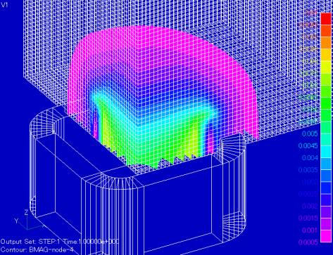 The file format is the same as the conventional pre_geom, etc. When the analysis is executed, the magnetic field is calculated at each node position defined in B_integ_mesh and the results are output to the B_integ file in the specified format. The B_integ_mesh file should contain not only nodal data but also element data, as it will be used for contour display in post-processing. Element data can be either solid or shell (plane) elements. The post_geom file does not include the B_integ_mesh data, but outputs only the COIL geometry. Fig.2 shows the magnetic field distribution calculated by the above function and displayed by FEMAP. fig.3 shows the magnetic flux density vector distribution with the shell element mesh as input data.