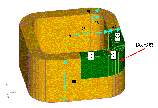 When calculating inductance with CALC_IND=1 or electromagnetic force with COIL_FORCE=1, the definition of integral elements is required. These definitions are done by LOOP-, GCE-, and ARC-. These have the same input format as LOOP, GCE, and ARC, respectively. However, the number of divisions and the number of Gaussian integral points must be entered at the end. These data are included in the coil definition. For example, the integral region in Fig. 1 is represented as follows. Since the upper half is defined here, CURRENT is also half. In this example, the number of coil turns is set to 100T.