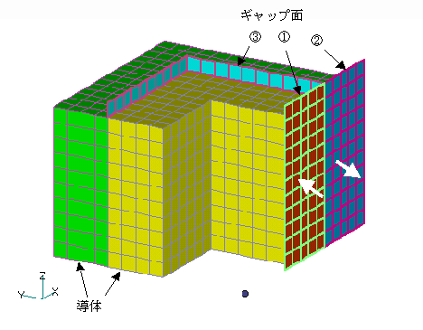 Consider the model shown in Fig. 1. The model is a 1/8 model, vertically symmetric, with 90-degree rotational symmetry; it can also be symmetric at x=0 and y=0. The gap surfaces (1) and (2) are also defined as surface inflow current (SUFCUR) surfaces and act like electrodes. Each surface is connected to the power supply by CIRCUIT. In this case, we assume equal currents in opposite directions and connect a constant current source. The gap plane (3) insulates the conductors and divides the gap planes (1) and (2). The analysis is a steady-state AC analysis at 50 Hz.