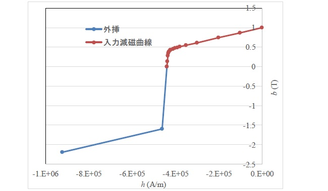 The demagnetization curve is set in the same way as the BH curve for magnetic materials. Enter the residual flux density $B_r4 ($H$=0) in the last data of the demagnetization curve. The recoil permeability in the easy magnetization direction is calculated from the slope between the residual flux density and the previous data. MU entered as linear material is used as the recoil permeability for the non-easy magnetization direction. ADD_EXTEND_POINT is added as an option. ADD_EXTEND_POINT: =1: Extrapolate the data using the recoil permeability if the demagnetization curve has no data in the 4th quadrant. This option is not necessary if there is also data in the 4th quadrant. The extrapolated data is output to a check file.
