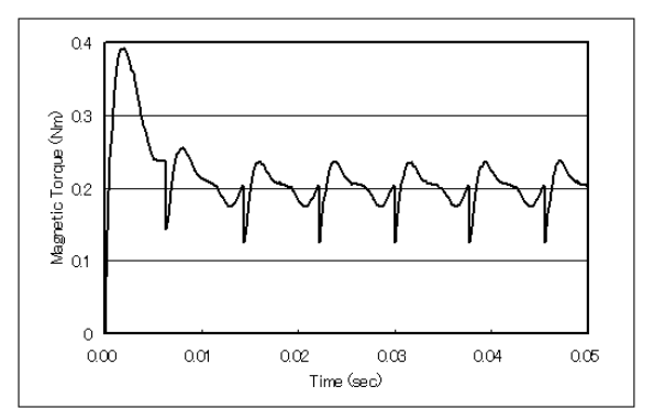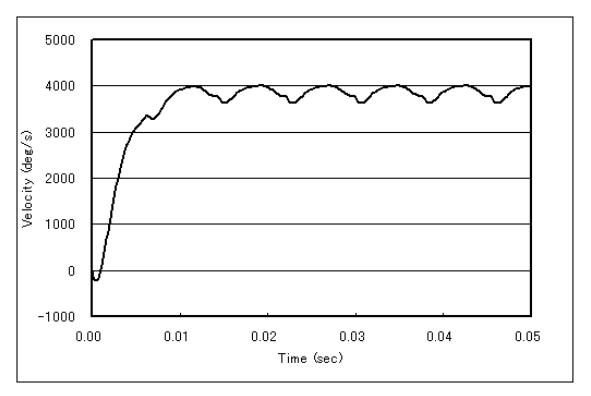 In the analysis, the moment of inertia of the rotor is assumed to be 10-5 kg-m2 and a constant torque of 0.2 Nm is applied externally. The analysis starts from a stationary state with an initial position of 3.27 degrees. The position, velocity, and electromagnetic torque obtained from the analysis are shown in Figs. 4, 5, and 6, and reach a steady state in about $10 ms$, yielding a rotational speed of about $3800 deg/s (630 rpm)$. This result is consistent with the torque of about $0.2 Nm$ at $600 rpm$ analyzed in "Analysis of DC brushless servo motors (using switch function)". In addition, in the steady state, the speed fluctuation is about 10%.