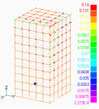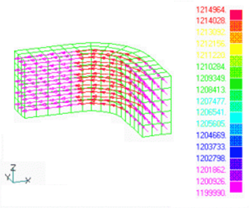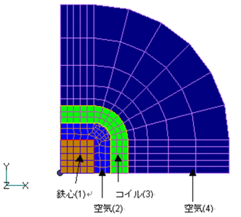 This is the total electromagnetic force in each direction acting on the iron core and coils of the model (1/8 model). The electromagnetic force distribution is output to the force file. Fig. 5 shows the nodal electromagnetic force (unit N) acting to the iron core. Electromagnetic force appears only on the surface of the component with a constant magnetic permeability. Similarly, calculate the Lorentz force for the coil (input.3). Looking at the electromagnetic force (List.1) for each material shown in the output file, the electromagnetic force acting on the coil calculated from the above nodal force and the one obtained here are almost the same. In this case, the electromagnetic force distribution is output to the force_J_B file. Fig.6 shows the Lorentz force distribution ($N / m^3$) of the coil part.