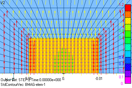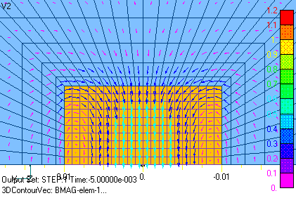 Now, we will perform an approximate analysis with two-dimensional calculations, but the important thing here is that the sum of the currents across the conductor cross section must be zero, and the bounding condition must be imposed. This condition can be imposed using EMSolution’s Surface Inflow Current Source (SUFCUR). This condition can be imposed by defining a SUFCUR on the conductor cross-section, connecting it to a constant current source, and setting its current to zero. If this condition is not imposed, the sum of the currents is generally not zero and depends on the applied magnetic field and boundary conditions. In the present analysis, the current is symmetric in the x=0 plane, so if we assume the Bn=0 boundary and analyze only the part where x is positive, the current will automatically be reversed in the opposite part, so the SUFCUR condition is not necessary. Figs. 5 and 6 show the two-dimensional eddy current density distribution in the z-direction. Figs. 5 and 6 correspond to Figs. 3 and 4 of the 3D analysis. It can be seen that the distributions in the cross section are in very good agreement. Figs. 7 and 8 show the magnetic flux density distribution. At phase 0°, the magnetic field is at its maximum and is distorted by eddy currents. The -90 degree is the point at which the applied magnetic field becomes zero, and the magnetic field that appears is due to eddy currents, which draw eddies.