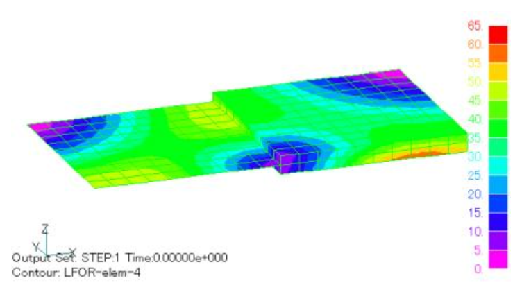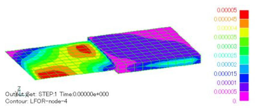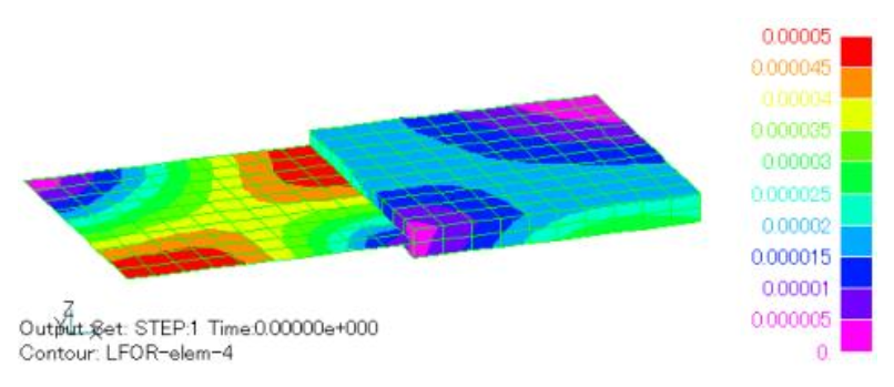 As an analytical example, we will use the model used in “Lorentz force acting on a non-magnetic thin plate element”. Fig. 1 and 2 show the electromagnetic force density distribution obtained by the nodal force and Lorentz force methods. If FORCE_NORDAL=2 is specified in the post output, the electromagnetic force density is output as an element quantity calculated by dividing the element force obtained by both methods by the element volume. The agreement between the two methods is good. Since the electromagnetic force in a nonmagnetic material is generally distributed over a volume, this is the best way to display it.
