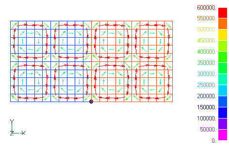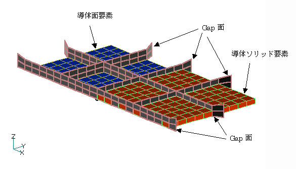 Fig. 1 shows the analytical model.This model adds a gap plane to the model shown in "Analysis of a Nonmagnetic Thin Plate by Surface Elements". The conductor is approximated by solid elements for $x > 0$, and non-magnetic thin plate elements for $x < 0$. Symmetry is assumed for y = 0 and z = 0. Except for the gap surface, the conditions are the same as in "Analysis of a Nonmagnetic Thin Plate by Surface Elements". Fig.2 shows the resulting eddy current density distribution. There is good agreement on both sides of the solid and surface elements, and the gap surface has the same effect. Please note, however, that this mesh model has coarse partitioning and is not expected to be accurate. The input method for gap surfaces and conductor surfaces remains the same as before. In order to cut a thin conductor surface at the gap face, it is necessary to define a gap face at least one element layer from the conductor surface, just as with a solid element.