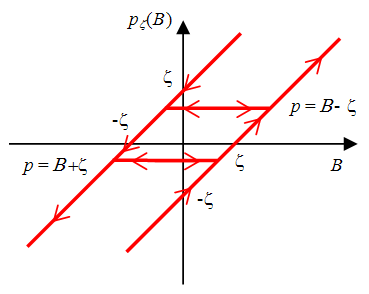 Although many modeling approaches have been proposed to express hysteresis magnetic characteristics, we have adopted the Play model, which has recently attracted much attention. The Play model is represented by a simple operator called hysteron, which delays the phase of the output relative to the input. Fig. 1 shows the operating characteristics of the play hysteron. The hysteron is represented by a simple equation as in equation (1), which is equivalent to the behavior of a two-cart model as shown in Fig. 2. In equation (1), $\zeta$ is the hysteron width, $B$ is the magnetic flux density, $p$ is the hysteron, and $p_0$ represents the past hysteron. The play model is obtained by preparing hysterons of various $\zeta$, acting on each hysteron with a function called the shape function, and taking the sum of all the hysterons.