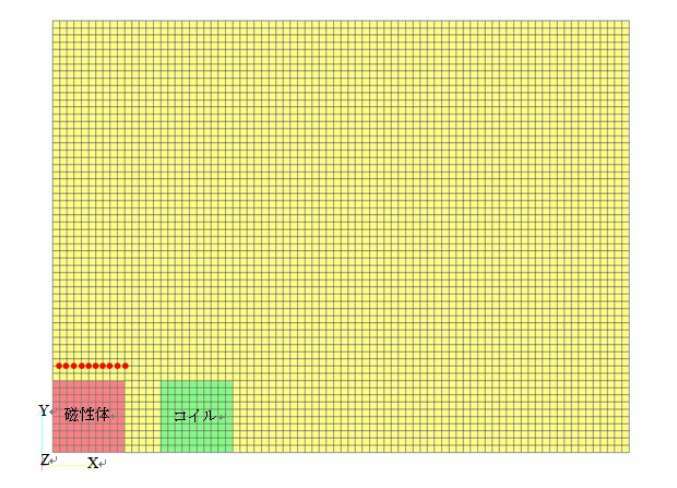 As in the three-dimensional case, $r_p$ is the coordinate of the spatial point for which the magnetic field is to be obtained and $R$ is the coordinate of the integration point. In a two-dimensional analysis, only the $J_z$ component needs to be considered, so the integral term for the current can be simplified. A simple model (Fig. 1) provides an example. The model consists of a linear magnetic material (specific permeability 1000) and a coil, with spatial points of evaluation on top of the magnetic material. A static magnetic field analysis is performed and Fig. 2 shows the magnetic flux density output as a nodal quantity at the space point coordinates and the magnetic flux density obtained from the field integrals of magnetization and current for each component. It can be seen that they are in good agreement, although there are some differences. In particular, there is a large difference in the By component, but this is due to the rather coarse mesh of the coil and magnetic material and, as mentioned in “Magnetic field by integration of magnetization and current”, the far boundary of the FEM mesh, since this is an open domain problem. As the far boundary mesh is elongated, the magnetic field calculated from the magnetization and current does not change, but the results obtained from the FEM asymptotically approach the results from the magnetization and current integrals.