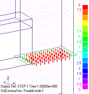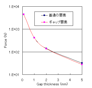 If there is a thin air gap in a magnetic circuit, analysis using ordinary finite elements requires very thin elements, resulting in poor convergence of the ICCG method. In this case, approximating the gap with a gap element facilitates the analysis. Consider the model shown in Fig. 1. The model uses the 1/4 symmetry condition. The coil uses surface-defined current 1 (SDEFCOIL). The gap surface is defined by a surface element. The gap surface must be defined as a single element overhanging the air region. For each element representing the gap surface, a unique property number is assigned and a file input (input.1mm) is defined. For the surface element properties, enter TYPE=2, conductivity 0, specific permeability 1, and the gap thickness in meters. Volume elements are defined as having no gap. Both sides of the volume element should be defined as separate property. The mesh is entered by pre_geom2D.neu and 2D_to_3D. The arrow distribution in Fig. 1 is the source current distribution given by SDEFCOIL. The resulting flux density distribution is shown in Fig. 2, and the nodal electromagnetic force distribution is shown in Fig. 3. List1 shows the electromagnetic forces output in the file output. In this case, the electromagnetic force in the z direction is meaningful. The total value includes the nodal force in the air part, which appears as an error. In this case, the sum of the upper yoke and coil electromagnetic forces and the lower yoke electromagnetic forces should match in action-reaction, but the difference should be considered as an error. Fig. 4 shows a comparison of the attraction force between the gaps when using ordinary elements and when using gap elements. When using ordinary elements, one-layer-thick hexahedral elements are placed in the gap. The agreement is better when the gap spacing is small. For example, for a 0.1 mm gap, the number of iterations of the ICCG method using ordinary elements is 274, whereas using gap elements, the number is reduced to 93, which requires less computation time.