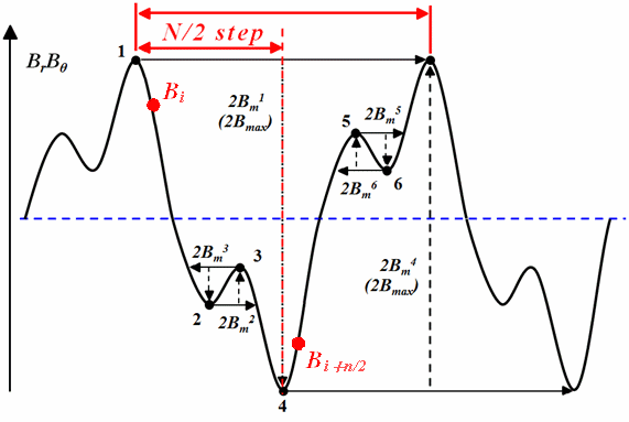 If the cycle is divided into $N$ parts, the value of the first step is B0, the value of the half cycle is $B_n/2$, and the average of peak to peak is zero and half periodicity is established (Fig. 1 blue horizontal line), then the i-th step after the half cycle can be expressed as $B_i = -B_n/2+i$. Considering the case of DC superposition, the first step $B_n/2+1$ after the half-cycle can be obtained by adding the difference between B0 and B1, and the second half cycle can be expressed by adding them in order.