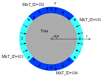 Since the coordinate system to be defined is a Cartesian coordinate system, COORD_ID=0, which is the ID of the entire Cartesian coordinate system, is specified for each MAT_ID. For MAT_ID=101, where the magnetic pole center is the x-axis in the global Cartesian coordinate system, set x-axis positive magnetization vector M(x,y,z)=(1,0,0). For other MAT_ID=102, 103, and 104, set the magnetization direction vector to y-axis positive = (0,1,0), x-axis negative = (-1,0,0), and y-axis negative = (0,-1,0) for one round, respectively.