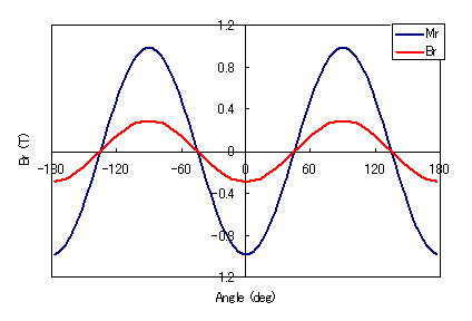 The sine function input is described below. In the case of radial orientation in the cylindrical coordinate system shown in Fig. 1 (a), the radial ($r$-direction) component $M_r$ of magnetization is defined in the angular direction ($\theta$-direction). Suppose that the distribution is expressed as a Fourier series of sinusoidal functions as in equation (1). Generally, odd-order harmonics are used, where the magnetization distribution is symmetrical.