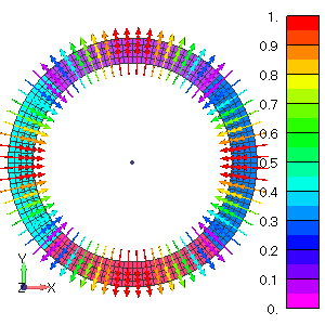 Since a local cylindrical coordinate system is defined and used, COORD_ID=1 is specified for each MAT_ID and the reference magnetization of the local cylindrical coordinate system is entered as (MR, MT, MZ)=(1.0, 0.0, 0.0). Here, the same coordinate system is used for each MAT_ID, but a different coordinate system may be used for each. If MT≠0.0 or MZ≠0.0, you can set the reference magnetization vector in any direction in the cylindrical coordinate system.