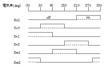 Fig. 2 shows the electrical equivalent circuit used in the analysis. It is assumed that the voltage sources (Vu, Vv, Vw) are given $30 V$ dc voltages. The On (closed) and Off (open) states of the switches (Su1, Su2, Sv1, Sv2, Sw1, Sw2) for each phase with respect to the electrical angle are shown in Fig. 3. When the first switch is On, a DC voltage is applied to the circuit, and when the second switch is On, the circuit conducts. Both switches are never in the On state. In the calculations, the switches are simulated with resistance values of 0 and 100 $k \Omega$ for the On and Off state switches. For the winding resistance, the resistance values (Ru, Rv, Rw) are assumed to be equal, and the average value of the measured values is $7.9567\Omega$.