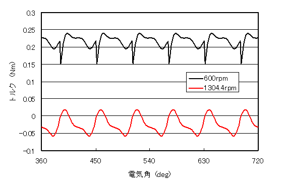 Fig. 4 shows the analysis results of the current waveform when the applied voltage is 30 V and the rotation speed is 600 rpm. Since the current reaches a steady state at the second cycle of the electric angle, the result of the second cycle is shown. It can be seen that the current between the windings is flowing as expected. Fig.5 shows the case where the rotation speed is 1304.4 rpm (with no load). Fig. 6 shows the torque waveform. These results are in close agreement with the results of the analysis in [Ref]. For example, the average torque value is 0.215492 $Nm$ at 600 rpm (engine A) compared to 0.216 $Nm$ at 600 rpm (engine B) reported in [Ref]. (In [Ref.], a discrepancy between the experimental and analytical values is reported due to the strength of the magnetization of the permanent magnet. Here we compare it with the analytical value under the same calculation conditions.)