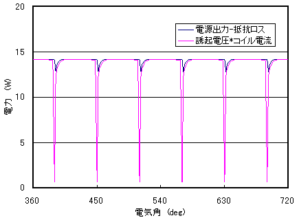 The two should be the same, but in this case, the former is about 4% smaller on average. This difference occurs during transients when spikes occur. Although the two values are in good agreement except during current transients, this is considered insufficient for the analysis of the spikes themselves. The mechanical work rate obtained by the torque agrees very well with that obtained by the coil induced voltage and coil current in the former case.