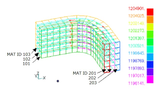 Figure 1 shows an application example. In this example, the x = 0 and y = 0 planes are mirror-symmetrical and Bn = 0. A current-inflow plane is defined on this symmetry plane. Current flows to the other symmetry plane. Figure 1 shows the current density distribution, but the current distribution is biased in the coil, and there is a difference of about 1.5 times. In case that it is easy to define SDEFCOIL with such a square cross section, SDEFCOIL is recommended. The orientation of the surface elements is free. Be sure to define the surface at the boundary of the analysis area. For reducing the current bias with PHICOIL, it is advisable to divide the coil cross section into parts and define each part with PHICOIL with different physical properties as shown in Fig.2. Here, the inflow-surfaces are also defined with different physical properties, but there is no problem even if they are defined with the same physical properties.