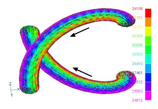 Periodic boundary conditions can be defined in the same way. Define an inflow-plane at one end plane of the periodic boundary. The coil elements connected to the periodic boundary plane (the plane moved by one period) of this end plane must have the same physical property number. For example, consider the case where two helical coils are arranged facing each other as shown in Fig. 3 and the analysis is performed considering the periodicity of a half period. At this time, if the periodic symmetry condition (CYCLIC = 0) is used, currents in the same direction flow through the two coils as shown in Fig.4. Also, if periodic anti-symmetry (CYCLIC = 1) is used, the currents will be in the opposite direction as shown in Fig.5. It is important that the mesh on the coil end surfaces match on the symmetry planes. Also note that in this case, the definition of the current-inflow surface is just one.