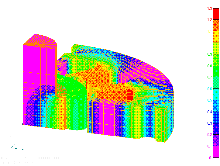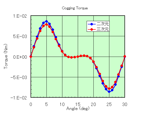 This analysis can be performed in the same way as the two-dimensional calculation ("Two-Dimensional Cogging Torque Analysis for Permanent Magnet Motors"), using the data pre_geom2D and rotor_mesh2D used for the two-dimensional analysis, extended in the z-direction with 2D_to_3D. The file input is almost the same as in the two-dimensional case, but the z-directional extension must be specified by 2D_to_3D. Fig. 1 shows the variation of the magnetic field intensity distribution with angle, which is not so different from the two-dimensional case, and the three-dimensional effect is considered to be small. Between the rotor and stator, the magnetic field intensity is slightly smaller at the coil ends. Fig. 2 shows the angular dependence of torque as well as the two-dimensional case. It can be seen that the torque is slightly smaller due to the end effect. This is closer to the actual measured value.