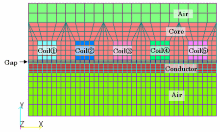 As a simple case, a multiphase AC model is shown in Fig. 3. A coil is fitted into the core and conductors are placed through gaps. The core is made of linear material with a specific permeability of 1000, and the conductors are given appropriate conductivity. In this case, the correction target of the simple multiphase AC EEC method is the coil section. As with the TP-EEC method and the simplified EEC method, it seems to be more stable to set THETA=1 for the time difference.