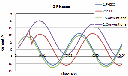 A sinusoidal voltage source analysis is performed with slip s=0.25. First, we show the results of applying the three-phase AC simple EEC method to the stator coils compared to the results of applying the simple EEC method to the stator coils.