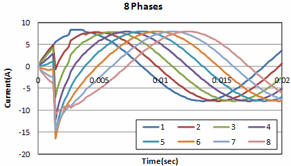 For the analysis, the leftmost phase was used as the reference phase, and calculations were performed by increasing one layer to the right, from 2 to 8 phases. As mentioned earlier, interpolation is performed for phases 2 to 8, so phase 2$m$ is actually phases 4, 8, 12, and 16. The coil currents resulting from the analysis in phases 2, 3, 5, and 8 are shown in Fig. 4. It can be seen that as the number of phases increases, the number of corrections increases, and thus the corrections are made earlier in the process. All phases can be corrected by the simple multiphase EEC method (P-EEC: Polyphase EEC). This shows that the simple polyphase EEC method is very effective.