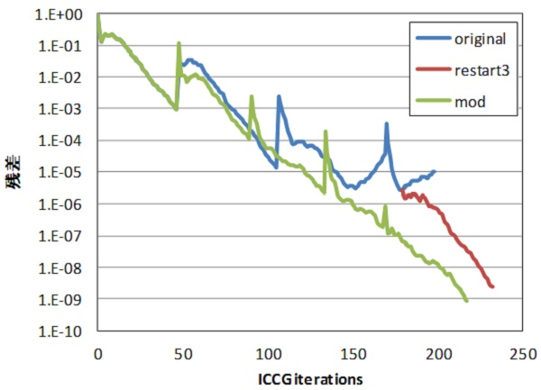 First, let us analyze the original data in the benchmark. Fig. 2 shows the number of ICCG iterations and residuals for the cases with coil current of 1 kA (first step).