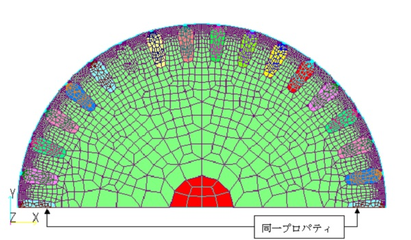 Fig. 4 shows an example of a finite element mesh in which the end rings are approximated as resistance in the model used in "Induction Motor Analysis". The rotor bars of the rotor must all have different property numbers. The rotor bars on the periodically symmetric surface are rotationally symmetric, so the same property numbers are set for them. In "Induction Motor Analysis", the power circuit is entered using CIRCUIT and the conductivity of the rotor bars is set to take into account the effect of end rings, as described above. In this example, NETWORK is used here instead of CIRCUIT, and NETWORK allows the resistance of the end rings to be set separately.