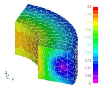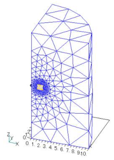 The magnetic field produced by a circular coil (average radius 1.5 m, rectangular cross section 1 m) is analyzed in a 1/4 domain model as shown in Fig. 1. The element partitioning is a tetrahedral unstructured mesh; EMSolution also has a current source input method using ELMCUR (internal current source), but it cannot be used for such an unstructured mesh. Possible input methods are SDEFCOIL and PHICOIL.