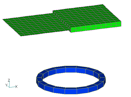 Previously, electromagnetic forces acting on non-magnetic thin plate elements were only calculated using the nodal force method, but we are pleased to report that we have added a function to calculate the Lorentz force ($J x B$). Nonmagnetic thin plate elements have a magnetic field in the vertical direction as an attribute, but they do not have a magnetic field in the in-plane direction, and the in-plane direction magnetic field is discontinuous at the top and bottom of the plane. For this reason, the calculation was difficult, and the development was delayed. However, the in-plane component magnetic field in a plane element is obtained by obtaining the in-plane magnetic fields in the upper and lower planes from solid elements that are in contact with the upper and lower planes and averaging them. A simple example of the calculation is shown below to evaluate its validity. As shown in Fig. 1, the analytical model is a half of a square plate, with one side ($x > 0$) modeled by a solid element and the other side ($x < 0$) by a face element. Assume that both have the same equivalent thickness. A magnetic field is applied with a circular coil, and the resulting eddy currents and electromagnetic forces in the conducting plate are calculated. The analysis is performed at a sufficiently low frequency of $10 Hz$ AC steady-state analysis.