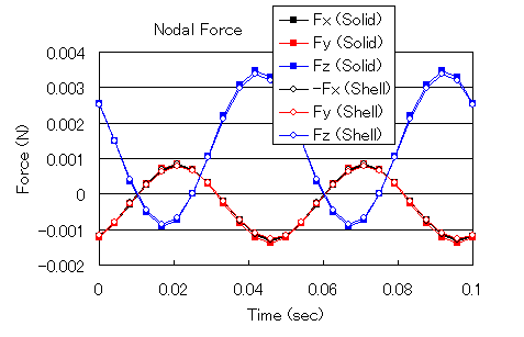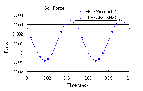Figs. 5 and 6 show the time variation of the integrated force in each direction on the solid element side and the face element side using the nodal force method and Lorentz force method, respectively. The agreement between the two is good, and the symmetry between the solid side and the face element side is also good. In other words, we can see the relationship Fx(Solid)=-Fx(Shell), Fy(Solid)=Fy(Shell), and Fz(Solid)=Fz(Shell). Fx on the face element side is shown with positive and negative values reversed for easy comparison.