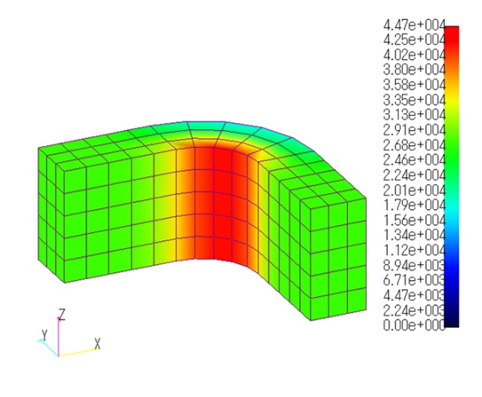 We have also output the heat generation value of the current magnetic field source in the heat post file (HEAT). Fig. 2(a) and (b) show the heat generation density distribution for SDEFCOIL and PHICOIL, respectively. In SDEFCOIL, the heat generation density is constant because the current density is constant, while in PHICOL, the heat generation density is also unevenly distributed because the current flows more inside the curved area.
