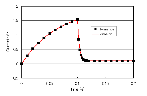 The circuit represented in Fig. 1 is represented by the data in Table 1. Table 2 shows the input format for the time-dependent variable resistance element (VR). While a constant resistance value ($\Omega$) is entered for the resistance element ($R$), for the variable resistance element, the time variation of the resistance value is specified by a time variation identification number (TIME_ID). A variable resistance element ($VR$) can be given a step change in resistance as shown in Table 3. In this example, the resistance is zero from time 0 to 0.1 second, and 1 $k \Omega$ from 0.1 to 0.2 seconds. (This data is equivalent to the data for the switch used in the "Improvement of Power Supply Input Method".) Of course, a continuous resistance change can also be analyzed. The analysis results of this example are shown in Fig. 2 and are in good agreement with the analysis values calculated from the resistance and inductance of the coil.