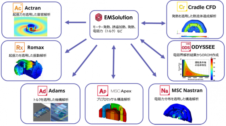 The reseller agreement will enable Hexagon to provide the following services: 1) sound and vibration analysis of motors by linking EMSolution with Actran and MSC Nastran, 2) thermal-fluidics analysis of 3D motor models and analysis considering temperature dependence such as electrical conductivity, by linking with Cradle’s CFD: scFLOW, 3) reduction of the number of cases and optimization of motor geometry by combining with ODYSSEE as a Reduced Order Model (ROM). This powerful combination with EMSolution and Hexagon’s engineering simulation software portfolio enables highly accurate motor system design.