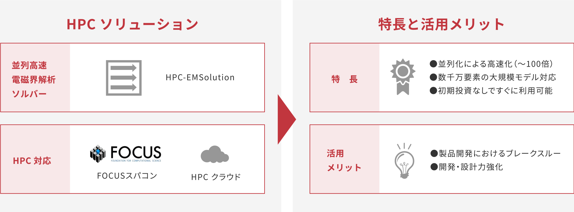 電磁機器の設計・開発では、高効率、高性能な製品開発のために、より複雑・精緻なモデルを用いた電磁界解析が必要となっています。当社では、このリクエストに応えるために、並列処理による高速化と大規模モデルに対する解析能力を圧倒的に向上させたHPC-EMSolutionを開発しました。これまでの電磁界解析の常識を打ち破る圧倒的な性能を持つソルバーをHPCソリューションとしてご提供します。