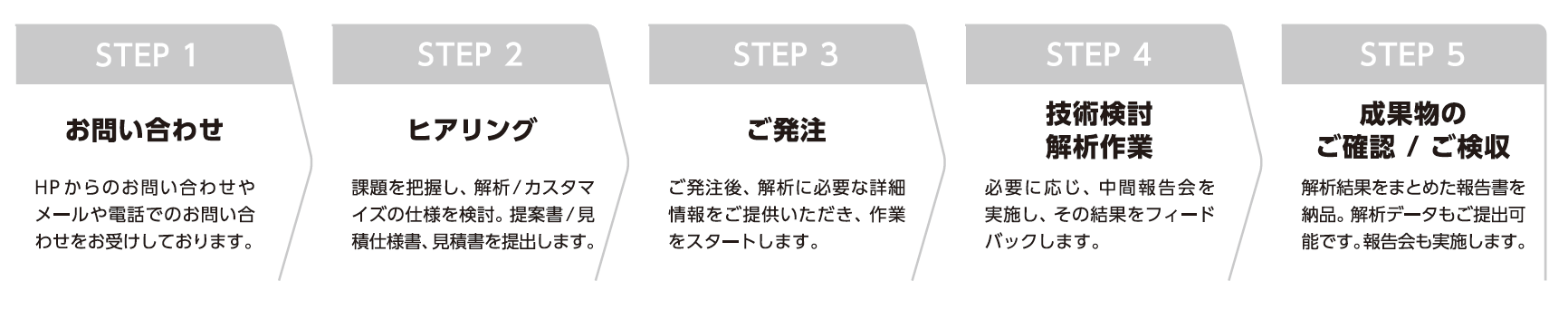 注)解析事例については、受託解析では秘密保持契約を締結するケースが大部分であり、具体的なご紹介は難しいのですが、「適用分野/事例」に示されている問題・事例を参考としてください。