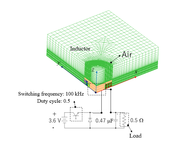 DC-DCコンバータ回路におけるインダクターの等価回路をCLN法で作成し、それを用いて電気回路シミュレーションを実施した例です。周波数依存の等価回路が生成できることから、過渡解析に適用できます。図1は、モデル化したDC-DCコンバータ回路になります。図2に回路シミュレーションの結果を示します。図3は、回路シミュレーション結果から、CLN法のポスト処理により求めた渦電流分布になります。