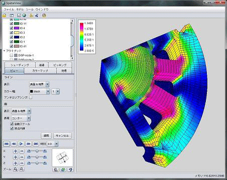 非定常解析の結果(コンター、ベクトル、変位)を、アニメーションで表示します。フレーム間のインターバル(時間)を調整することにより、ローエンドのコンピューターでも適切にアニメーションが表示されます。