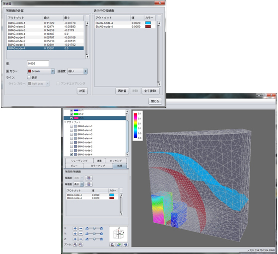 同じスカラー値を持つ面を作成します。等値面の色や透明度を指定することができ、複数の等値面を同時に表示することができます。