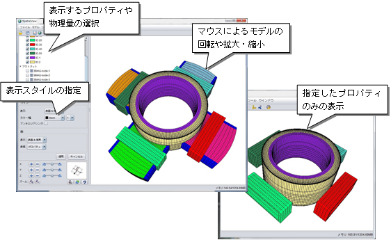 SpatialViewは、3次元の数値解析結果や計測データのコンター表示やベクトル表示を行います。操作性の優れたユーザーインタフェースを活用して、モデルを容易に把握することができます。さらに、ポスト処理(データ表示)に特化することにより、100万要素を超える大規模モデルを、通常のパーソナルコンピューターで表示することができます。