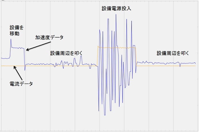 図は小さな回転機械の電流(CTセンサー使用)と加速度(BLE対応加速度センサー使用、水平1成分)を同時計測した例です。設備のスイッチを入れると、設備の加速度が大きくなりますが、それ以外の要因でも加速度は検知されます。しかし、設備稼働に伴う加速度パターンは、他の要因とは異なります。このような簡易計測からでも、稼働状態他の情報を得ることができます。
