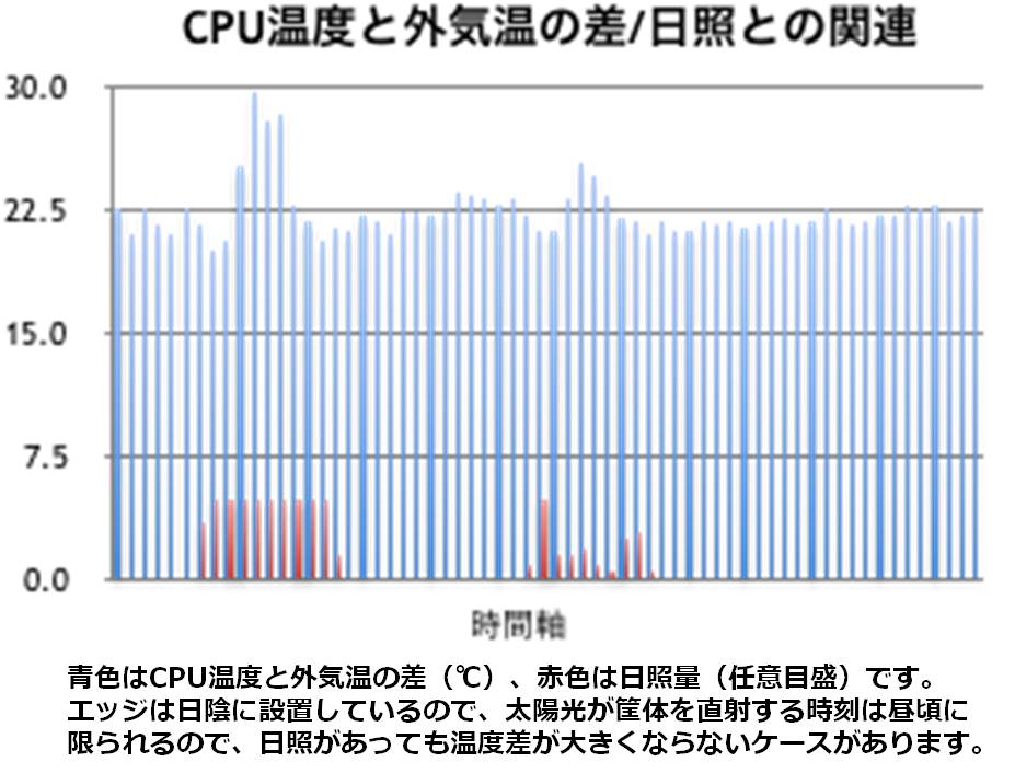 - 2018.4.13 IoTで気象を実感できる話 今回のテーマは屋外設置のIoTエッジの話題です。図は、防水・防塵筐体中に収納したエッジコンピュータのCPU温度と気象庁が発表する気温の毎正時の温度差をプロットした例です。昼頃に太陽光が筐体を直射する場合を除き、温度差は大雑把には一定です。深夜の短い時間だけCPU温度が少し上昇した事があり、気象庁のデータを調べると気温が一時的に上昇していました。曇りや雨の日は昼頃の温度差が小さくなります。このシステム、気象観測を目的とした訳ではありませんが、気温、日の出の時刻、天候等が手にとるように解ります。